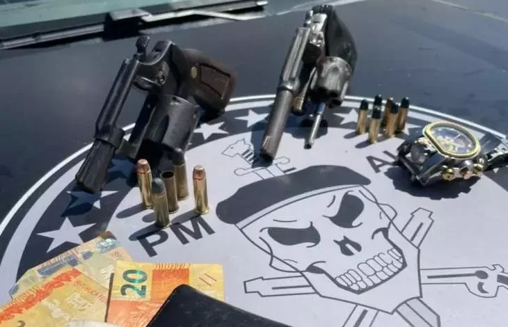 Com reforço do helicóptero Falcão 03, da Segurança Públicam, rondas foram realizadas até localizarem o carro estacionado em uma via vicinal e capturaram os dois indivíduos, de 20 e 23 anos, que não tiveram seus nomes divulgados. Duas armas de fogo municiadas – um revólver calibre 32 e um revólver calibre 38 – foram encontradas com eles.