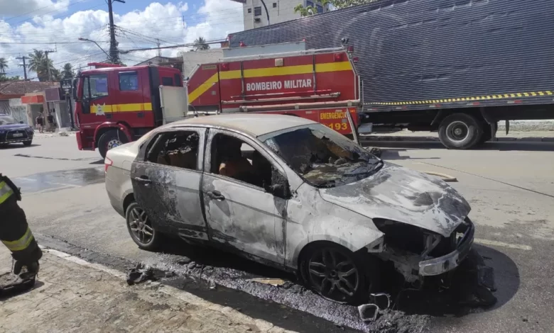 Carro fica destruído após pegar fogo em praça de União dos Palmares