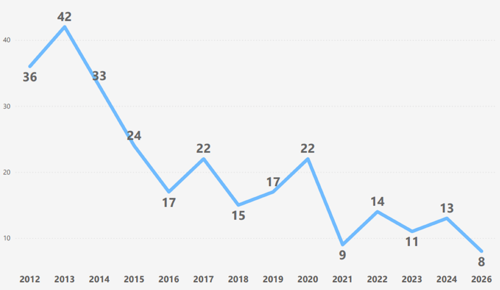 Ainda segundo o Neac/SSP, no comparativo com 2025, quando foram registrados 13 CVLIs, a queda foi de 38,5%. O quantitativo obtido é o menor desde 2012, quando a série histórica começou a ser divulgada.
